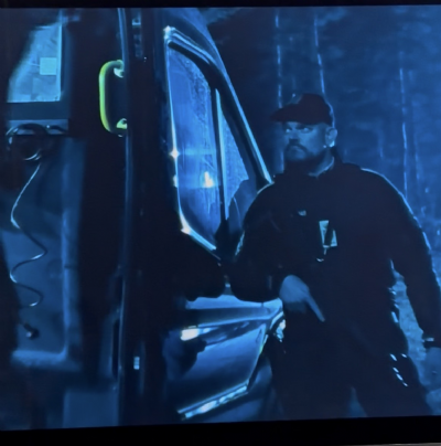 Statist som uniformeret Politibetjent med gevær i Anders Thomas Jensen film “Det sidste Viking” 2024 indspilning. Zentropa film.